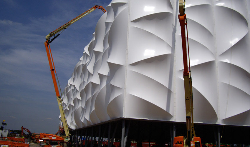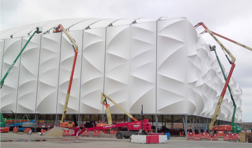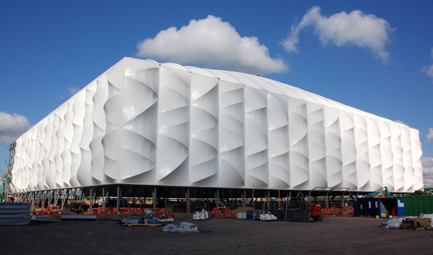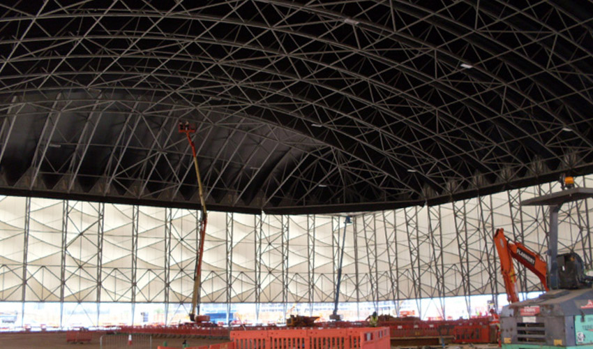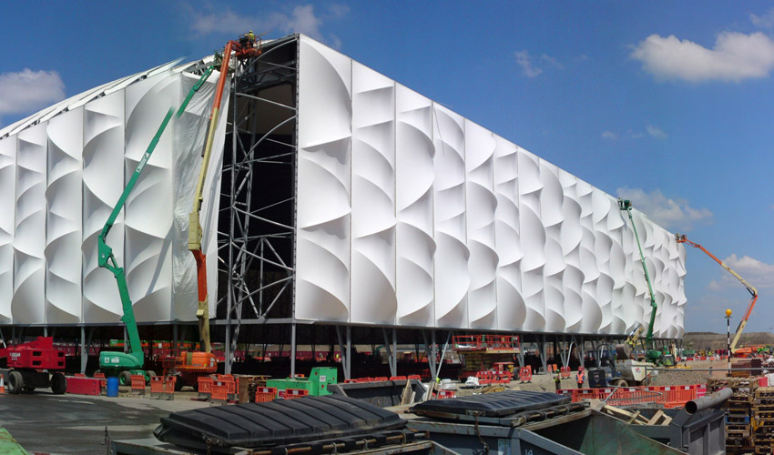 A steel truss 'skeleton' frame structure enclosed by panels which also form the interior space. Armadillo supplied all the high level cladding panels and also built a temporary steel structure to prove the fabric at our factory in Malmesbury as Proof of Concept.